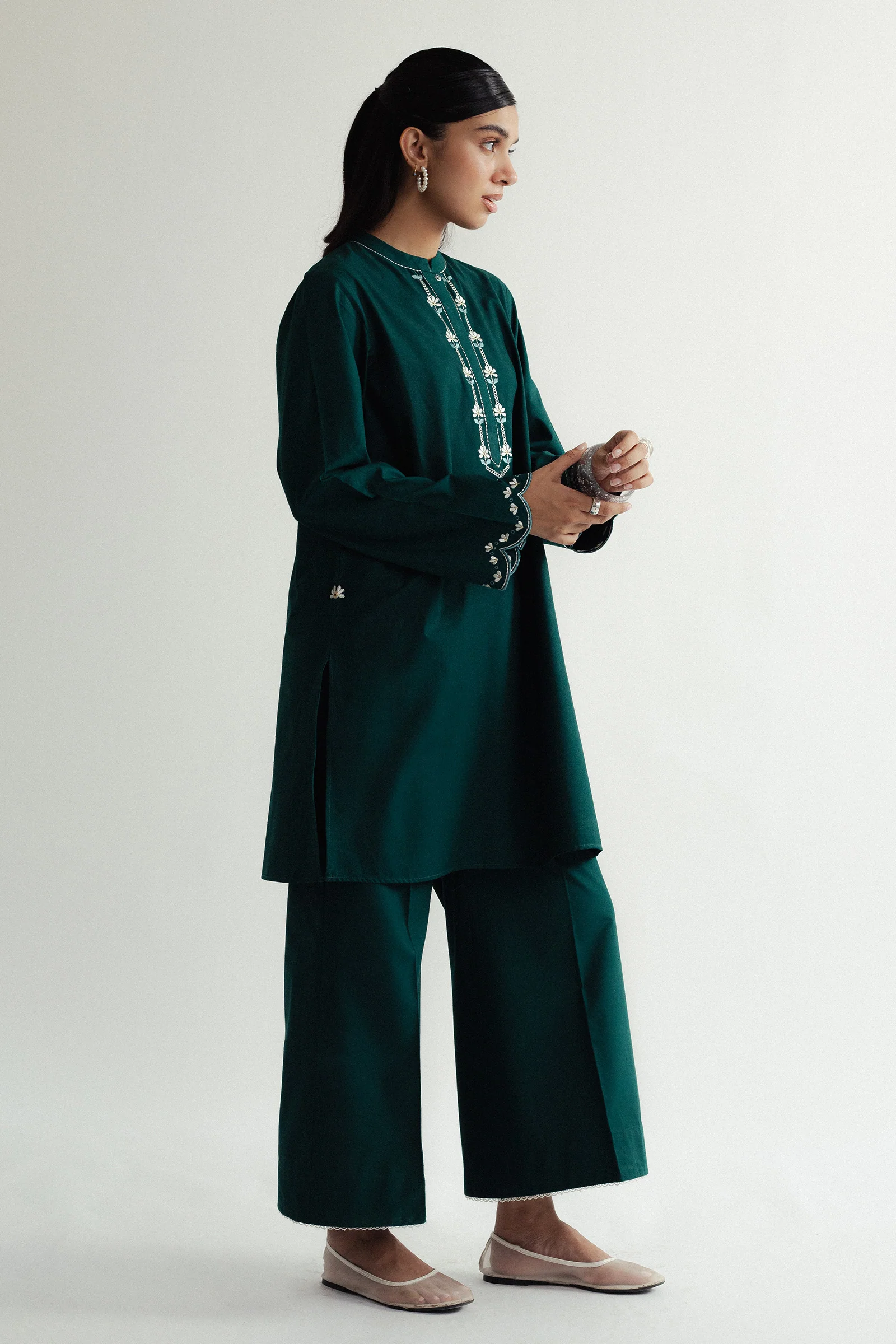 A teal kurta with intricate embroidery on the neckline and sleeves, paired with wide-hem pants for a refined yet effortless look.