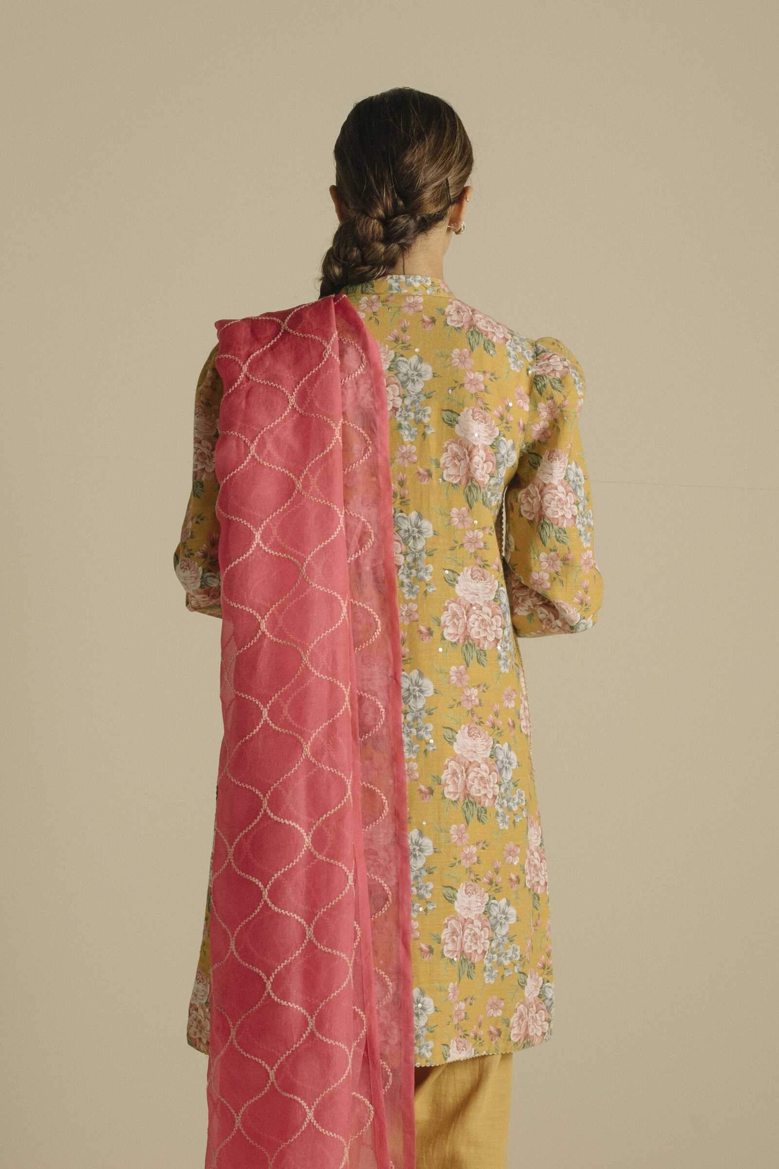 Floral yellow straight-fit kurta, with sequin embroidery all over enhanced with hand-crafted gota motif on sleeves, paired with our classic tapered shalwar and neon pink embroidered dupatta.