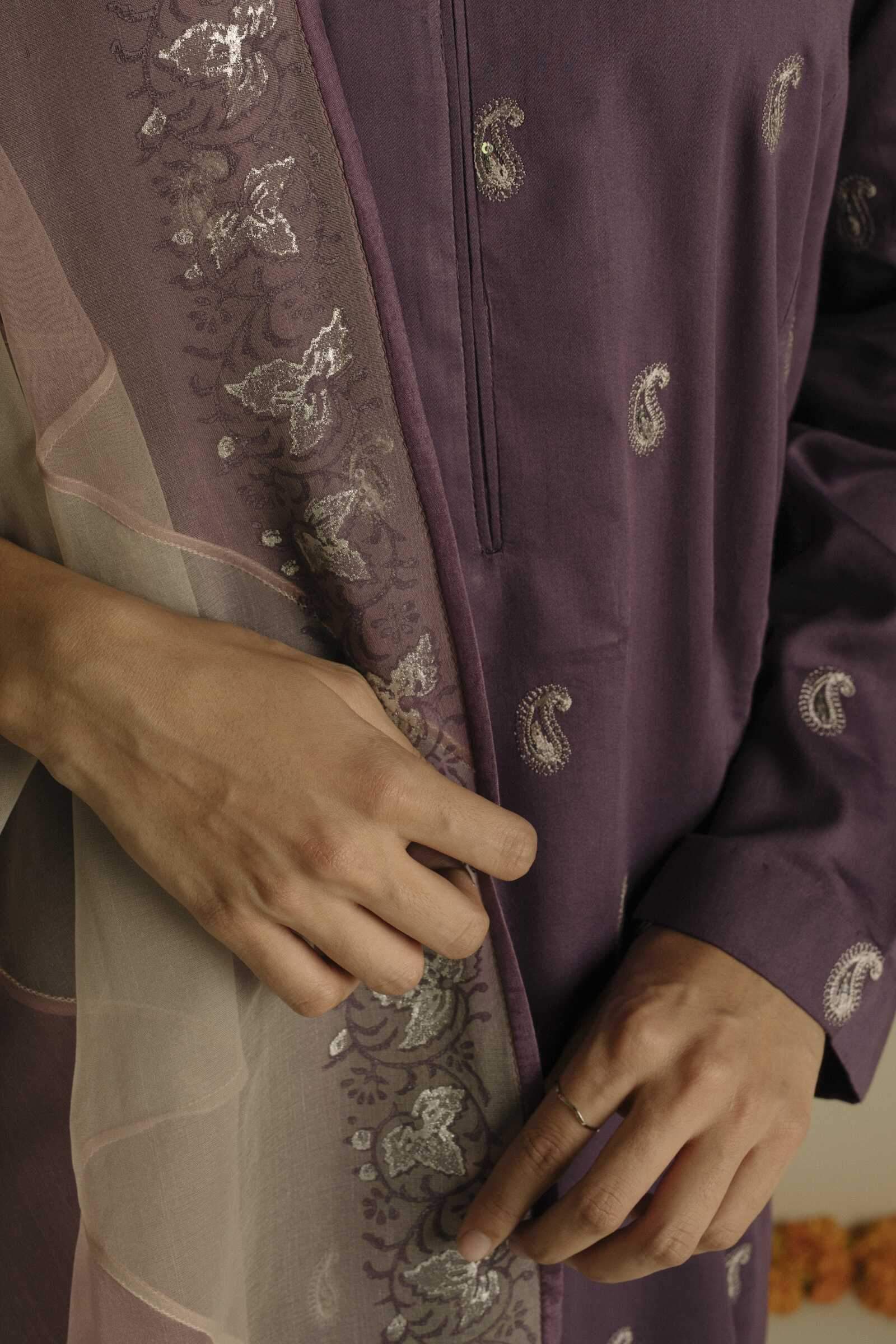 Wildberry purple regular-fit kurta, with sequin spray all over, paired with a tapered shalwar and our customized two toned chatta-patti dupatta with hand block print details.
