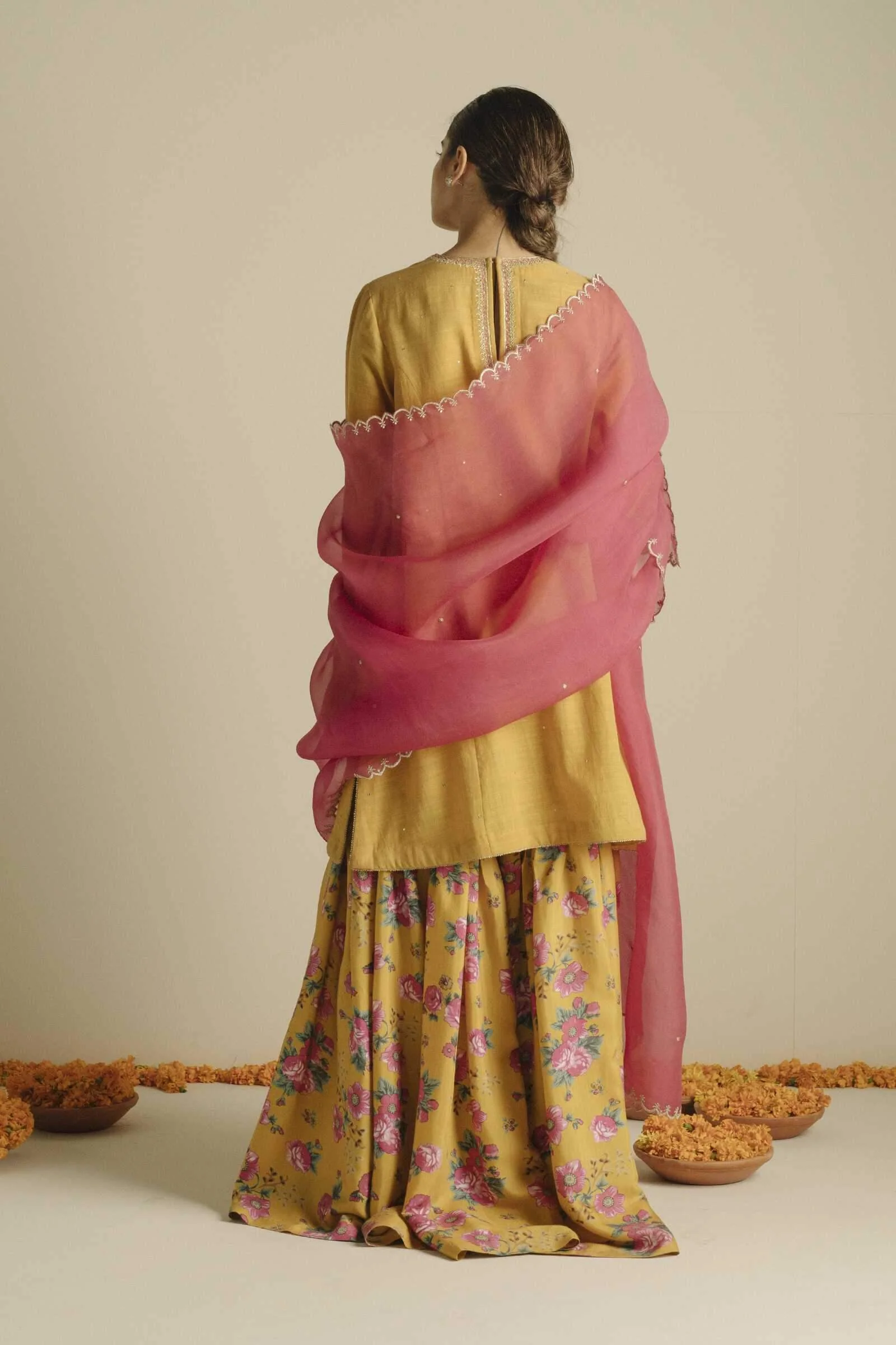 Canary yellow straight fit kurta, with intricate embroidery and front motif detail, paired with a floral gharara and a pink embroidered dupatta.