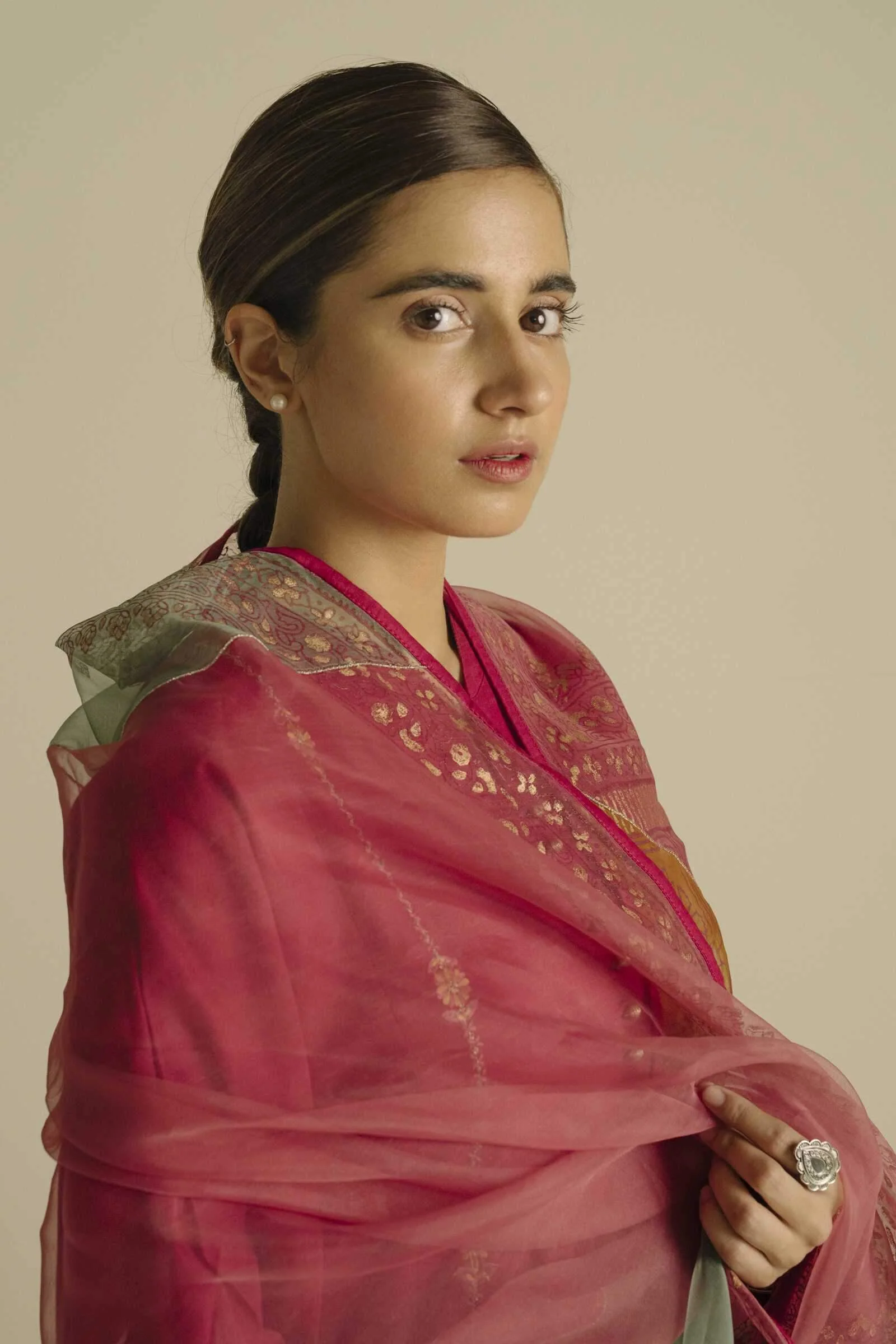 Ruby pink regular fit kurta, detailed with intricate sequin embroidery, paired with sharara pants and a colorful chatta-patti dupatta with hand block-print details.