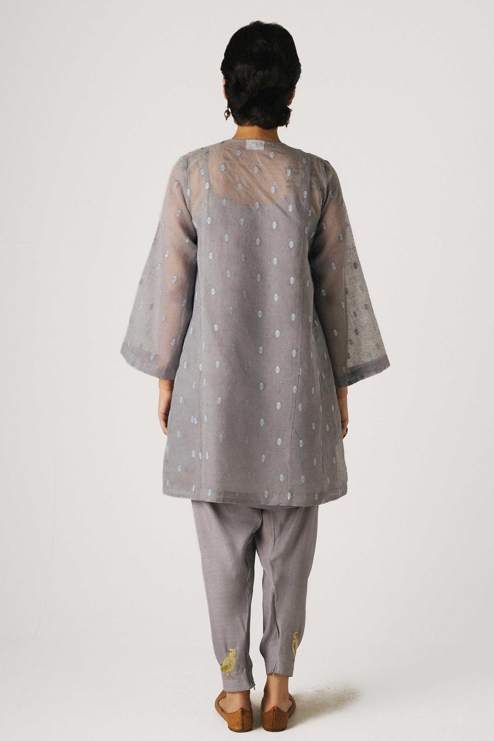 Carolina blue panelled kurta with embroidery all over, paired with our classic tapered shalwar beautifully enhanced with an embroidered parrot motif.